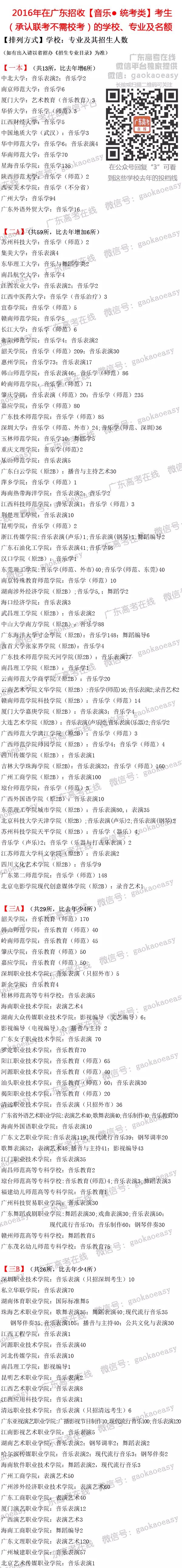 以下是广东高考在线独家整理汇总的2016年所有在广东省招收体育类考生、音乐统考类(不用校考)考生的省内外学校、专业和各专业招生人数。