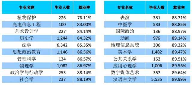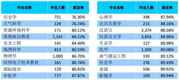 就业率小于90%的专业(专业人数在100人及以上)有20个,最低的是历史学,为76.30%,其次是大气科学,为76.74%。