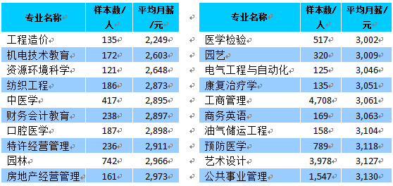 平均初次就业薪酬最低的专业是工程造价,为2249元/月;其次是机电技术教育,为2603元/月。