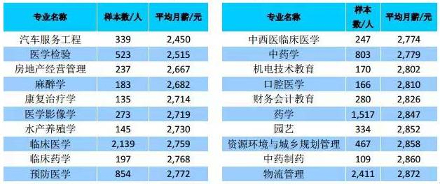 平均初次就业薪酬最低的专业是汽车服务工程, 为2, 450 元/月;其次是医学检验,为 2, 515 元/月 。 平均月薪最低的前 20 个专业中, 医学类专业占了 12 个。