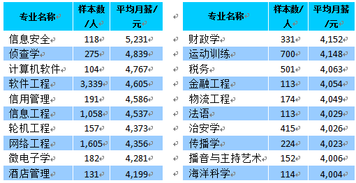 从专业平均月薪看,平均初次就业薪酬最高的是信息安全专业,为5231元/月,其次是侦查学,为4839元/月;第三是计算机软件,为4767元/月。平均月薪最高的前10个专业中,工科类专业占了5个。