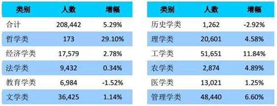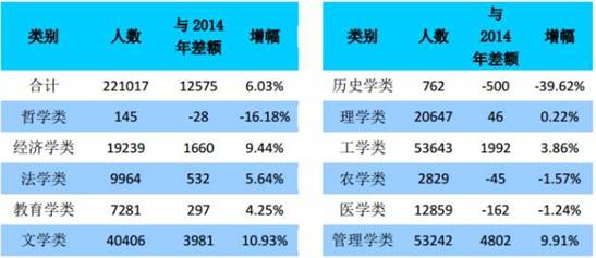 与2014年相比,教育学类的增幅比例最大,为17.12%;其次是医学类,增幅为13.86%;第三是理学类,增幅为10.51%。增幅最小的是哲学类,为1.22%。