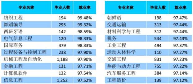 在各专业(专业人数在 100 人及以上)的初次就业率中,就业率最高的是纺织工程,为99.48%;其次是舞蹈编导,为9.32%,其次是西班牙语,为98.59%。就业率最高的前 20名专业中,有11个属工学类。