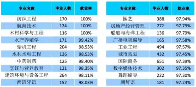 在各专业(专业人数在 100 人及以上)的初次就业率中 ,就业率为 100%的有纺织工程、航海技术和木材科学与工程等三个专业。就业率最高的前 20 名专业中,有 9 个属工学类。