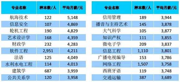 从专业平均月薪看, 平均初次就业薪酬最高的是航海技术专业, 为 5, 148 元/月,其次是信息安全,为 4, 869 元/月 ;第三是轮机工程,为 4, 829 元/月。平均月薪最高的前 10 个专业中,工科类专业占了 5 个。