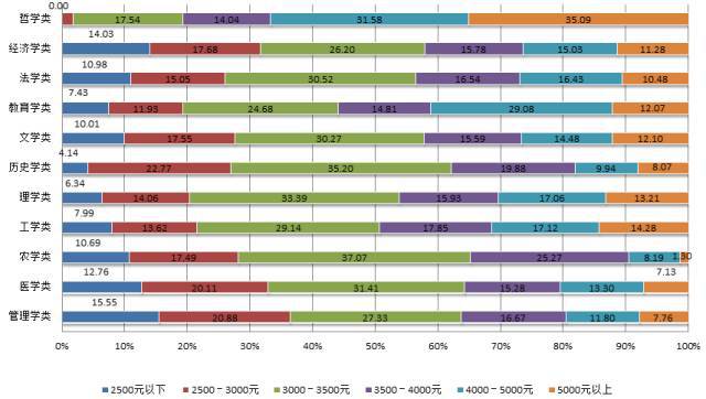 哲学类毕业生获取薪酬较多的在4000-5000元以上区间,其他各学科大类毕业生薪酬集中在 3000-3500元区间;获取 4000 元以上薪酬比例最大的是哲学类,占该学科已就业毕业生的 68.35%;其次是工学类,占 21.99%。