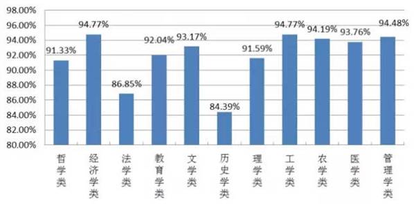 在本科各学科初次就业率中, 高于本科平均初次就业率的学科有工学类、经济学类、管理学类、农学类和医学类 5个学科。其中工学类和经济学类毕业生就业率最高,为94.77%;其次是管理学类,就业率为 94.48%。历史学类毕业生就业率最低,为 84.39%;其次法学类,就业率为 86.85%;第三是哲学类,就业率为 91.33%。