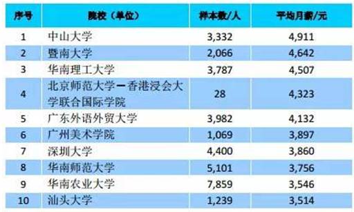 2014年,中山大学平均初次就业薪酬最高,达4, 911 元,其次是暨南大学,为 4,642元,第三是华南理工大学,为4, 507元。