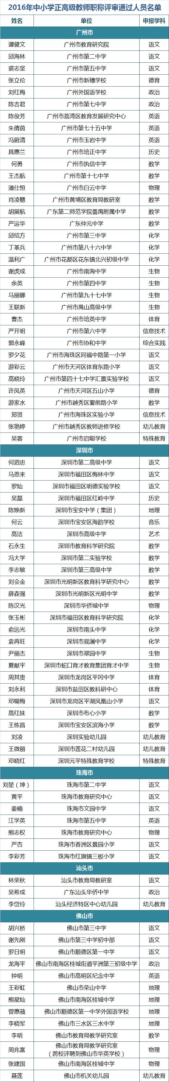 2016年省中小学正高级教师职称评审委员会评审工作已经结束,根据省人社厅、省教育厅《关于印发〈广东省深化中小学教师职称制度改革实施方案〉的通知》(粤人社规〔2016〕5号)、《关于做好2016年度中小学正高级教师职称评审工作的通知》(粤人社明电〔2016〕56号),以及《广东省高、中级专业技术资格评审委员会评审通过人员公示管理办法》(粤人发〔2002〕236号)等文件要求,现对评审通过人员进行公示。