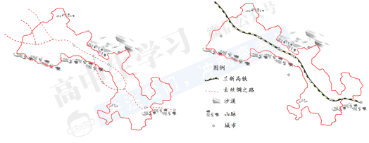 材料二 古“丝绸之路”在甘肃省境内部分示意图和兰新高铁甘肃段分布示意图。