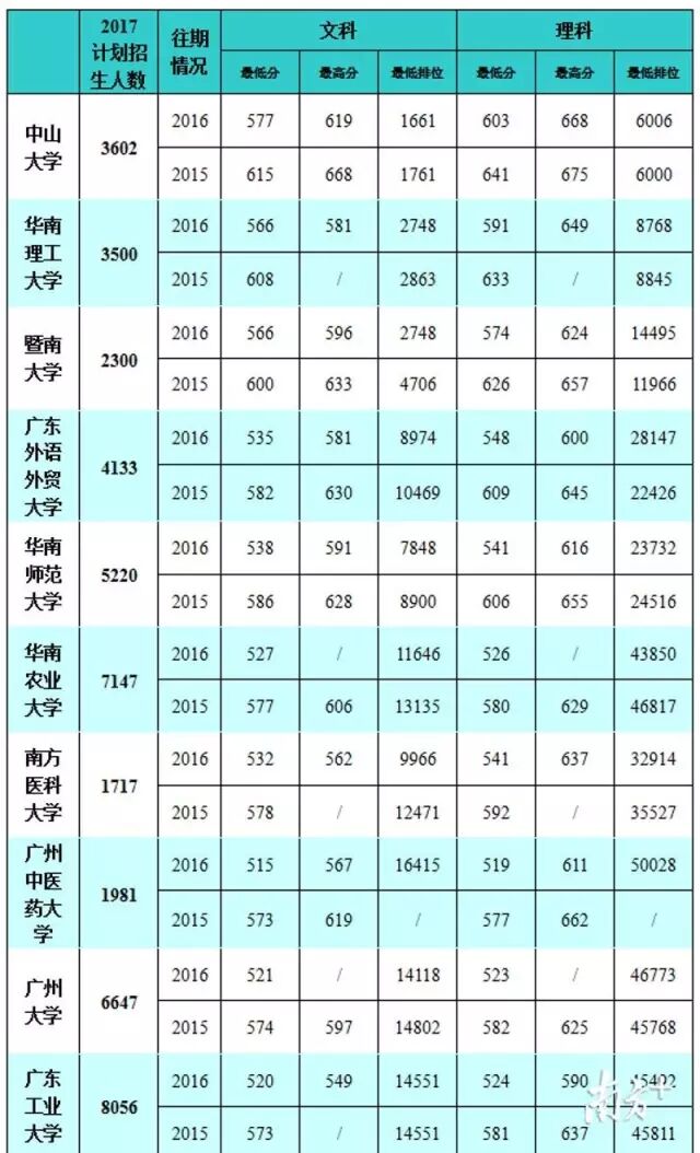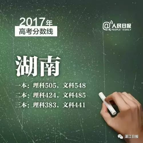 湛江考生盼望已久的 高考成绩公布啦! 广东省教育考试院 正式公布广东省2017年普通高校招生 各批次录取最低控制分数线 今年广东省普通高校招生各批次录取最低控制分数线如下: 一、第一批本科院校(含执行本批次最低控制分数线的提前批本科院校) 文科类:总分520分。 理科类:总分485分。 体育类:文化科总分330分,体育术科235分。 美术类:文化科总分308分,美术术科230分。 音乐类:文化科总分295分,音乐术科220分。 重点高校招收农村和贫困地区学生(地方专项计划): 文科类总分500分,理科类总分465分。 二、第二批本科院校(含执行本批次最低控制分数线的提前批本科院校) 文科类:总分418分。 理科类:总分360分。 体育类:文化科总分280分,体育术科190分。 美术类:文化科总分280分,美术术科210分。 音乐类:文化科总分250分,音乐术科190分。 高水平运动队(含一本、二本): 文科类总分460分,理科类总分420分。 三、第三批专科院校(含执行本批次最低控制分数线的提前批专科院校) 文科类:总分210分。 理科类:总分200分。 体育类:文化科总分190分,体育术科180分。 美术类:文化科总分190分,美术术科160分。 音乐类:文化科总分190分,音乐术科150分。 四、高等院校招收中等职业学校毕业生 中职毕业生:文化科总分180分,并取得广东省中等职业技术教育专业技能课程考试合格证书。 高职院校招收退役士兵:文化科总分120分。 高职院校招收内地西藏新疆班:文化科总分120分,并取得广东省中等职业技术教育专业技能课程考试合格证书。 五、订单定向培养农村卫生人才 (一)第一批本科院校农村卫生人才定向: 理科类总分465分。 (二)第二批本科院校农村卫生人才定向: 理科类总分335分。 (三)第三批专科院校农村卫生人才定向: 理科类总分310分,文科类总分370分。 六、各类院校招收少数民族聚居地区少数民族考生 (一)第一批本科院校少数民族预科班: 文科类总分480分,理科类总分445分。 (二)第二批本科广东技术师范学院(民族班): 文科类总分380分,理科类总分320分。 (三)第二批本科院校少数民族预科班: 文科类总分370分,理科类总分310分。 (四)第三批专科广东技术师范学院(民族班): 文科类总分360分,理科类总分300分。 七、其他预科班 第二批本科院校边防军人子女预科班: 文科类总分350分,理科类总分300分。 如何查高考成绩? 6月25日12:00可查高考成绩, 五种方式任您选择