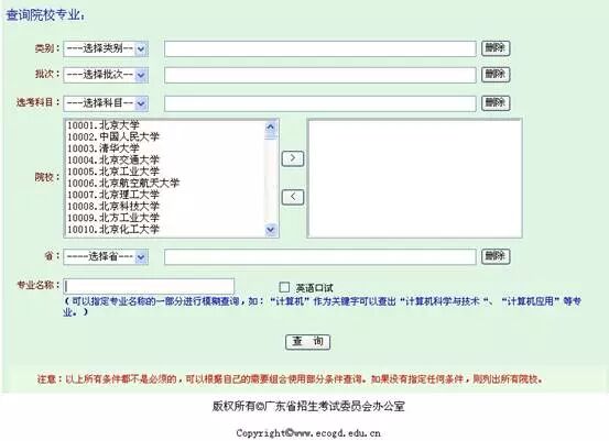1、查询招生专业目录:根据考生选择的条件,筛选出符合条件的高校和专业;
