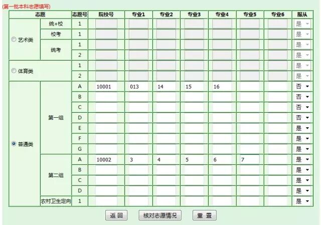 首先选择批次的志愿类,如选择填报普通类,则在普通类院校里面填报,输入完毕后,点击核对志愿情况