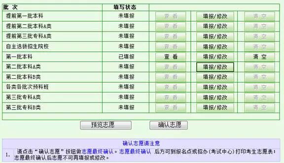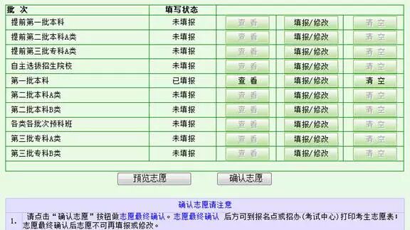 如果发现志愿有误,则点击相应批次的“填报/修改”按钮来修改相应的错误信息。如果要清除掉该批次的志愿,则点击相应批次的“清空”按钮,将清空掉该批次的志愿。