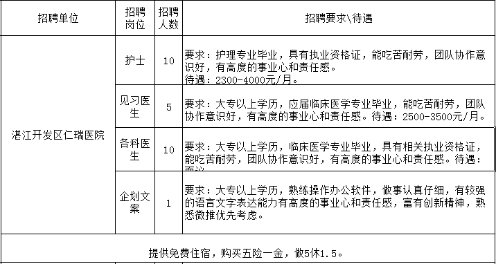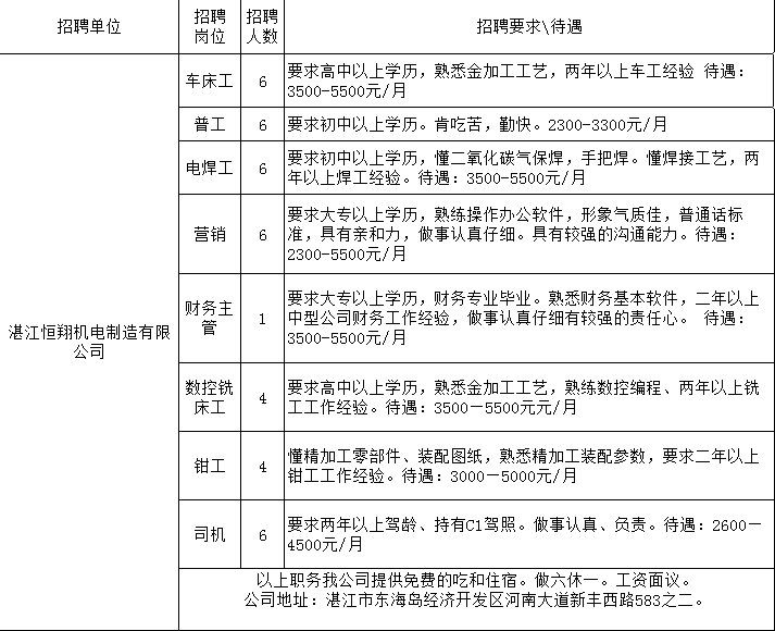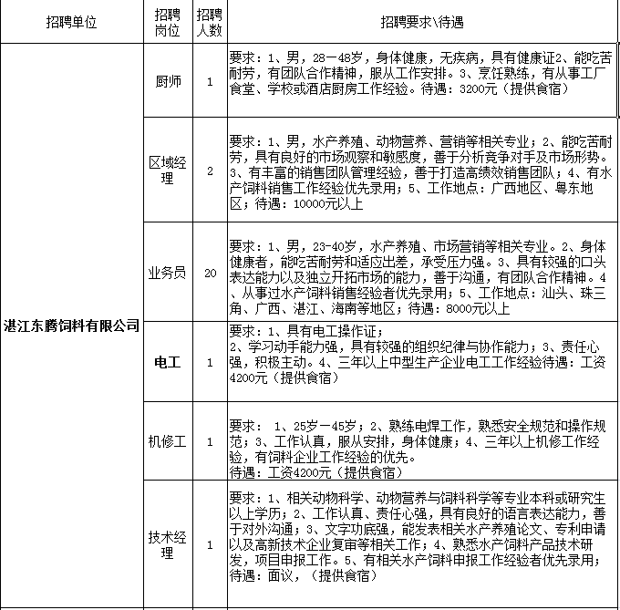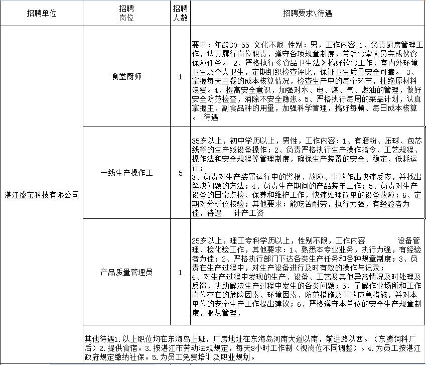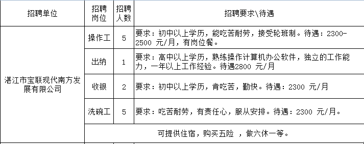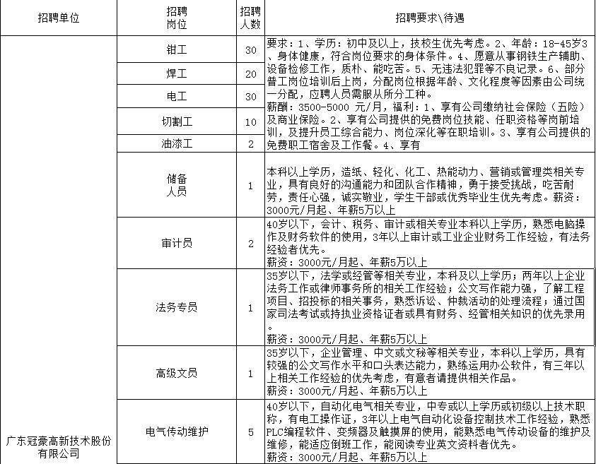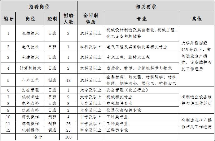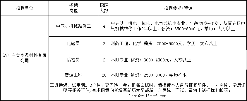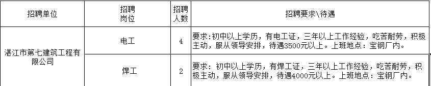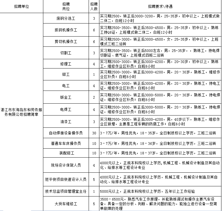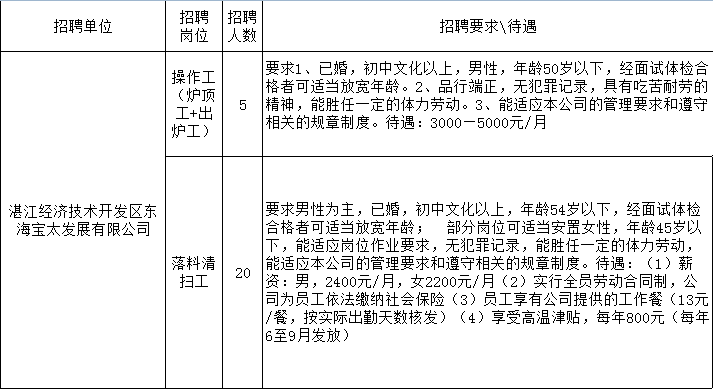 我区定于2017年8月9日和市人社局联合在东海汽车客运站举办湛江开发区2017年劳务招聘会。届时将有宝钢湛江钢铁有限公司及其配套企业、在东海岛企业等15家企业进场招聘,现场提供500个岗位竞聘(详情请看下文)。招聘会对进场求职者实行免费服务,欢迎求职者踊跃参加。 湛江经济技术开发区人力资源和社会保障局 2017年7月27日 一、招聘条件 1、学历:全日制中专(高中、技校)及以上学历,大专(高职)及以上学历优先考虑。 2、专业:详见招聘岗位要求。 3、工作经历:有制造业生产操作、设备维护相关工作经历,有钢铁行业工作经历及相关职业资格证书者优先考虑。 4、户籍:湛江市户籍,同等条件下东海岛户籍者优先考虑。 5、年龄:25周岁(含)至35周岁(含)。 6、身体健康,体态匀称,无传染病,无色盲,无听力问题,具备符合岗位要求的身体条件。 7、有下列情形之一者不得参加应聘: (1)违反国家及广东省计划生育政策规定,被处理处罚未满五年的; (2)吸食毒品,或有吸食毒品经历的; (3)被公安机关处以行政拘留及以上处罚的; (4)宝武集团各分子公司及相关配套单位的在职员工、半年以内的离职人员(2017年2月1日以后离职者)。 二、招聘岗位 机械技术、电气技术、生产操作、设备维护等岗位,具体招聘岗位及要求如下: 三、薪酬福利 1、薪酬水平:试用期按照全日制学历执行下表所示起始薪资,试用期满转正后根据能力和聘用岗位执行岗位绩效薪资,后续将按年度根据个人能力和业绩表现调岗调薪。 2、社保及福利:按国家规定为员工缴纳养老保险、医疗保险、生育保险、失业保险、工伤保险及住房公积金;为员工提供固定线路的通勤车,以及每月300元交通补贴;为员工提供岗位技能、任职资格等岗前培训及岗位深化等在职培训。 四、报名方式 即日起至2017年8月9日,可通过以下三种方式之一(任选一种,请不要重复报名)完成报名: 方式1(推荐优先选择):关注“走近湛钢”微信公众号,在线报名(详见附件1微信报名指引)。 方式2:填写附件2报名表,将电子版报名表通过电子邮箱发送至zjgthr@baosteel.com。 方式3:填写附件2报名表,打印后送交开发区各镇(街)劳动保障所,或者在8月9日9:00-15:00东山汽车站招聘现场填写并报名 五、面试及后续安排 1、面试及测试:报名筛选通过的,参加机试、面试等环节考察,计划安排在8月中旬,具体时间、地点将通过电话、短信等形式通知。面试时请带好:面试编号、简历表、身份证原件、户口簿原件及相关证书原件,已婚且已生育人员还需带好《计划生育服务证》原件。 2、体检:通过机试、面试考察的,安排在湛江指定医疗机构进行体检,费用由湛江钢铁承担,具体时间、地点将通过电话、短信等形式通知。 3、集中培训:体检合格后,湛江钢铁将组织为期1个月的理论培训,具体时间、地点将通过电话、短信等形式另行通知。培训作为招聘考察环节之一,培训期间不签订劳动合同,提供用餐补贴。 4、入职:培训考核合格的,安排与湛江钢铁签订劳动合同,入职成为正式员工。 附件:1、微信报名指引 2、应聘报名表(报名表请登录我局官网http://gdzj.lss.gov.cn/进行下载,或者点击原文阅读进行下载查阅。) 宝钢湛江钢铁有限公司 2017年7月26日