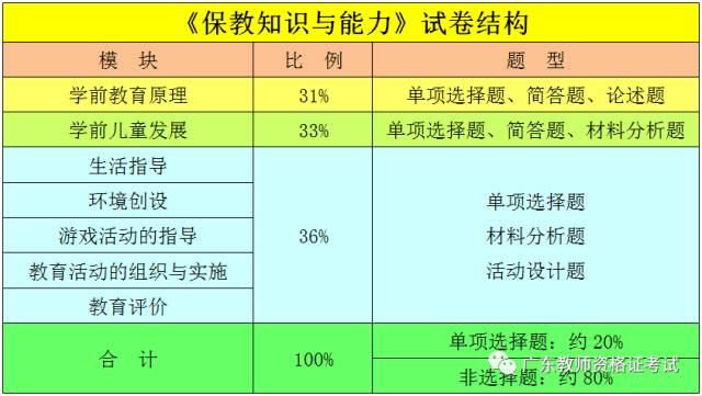 (1)幼儿园教师资格考试笔试科目共两科:科目一为《综合素质》,科目二为《保教知识与能力》。