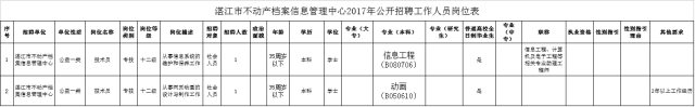 招聘岗位、名额、条件、专业要求等详见《湛江市不动产档案信息管理中心2017年公开招聘工作人员岗位表》(附件1)。(点击点击查看大图)