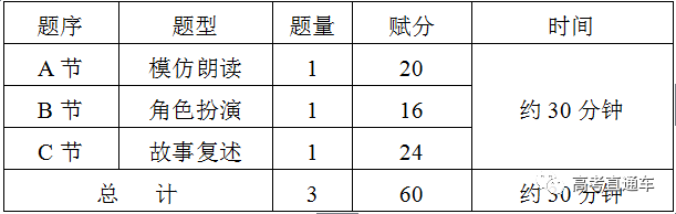 考试题型:A节模仿朗读、B节角色扮演、C节故事复述
