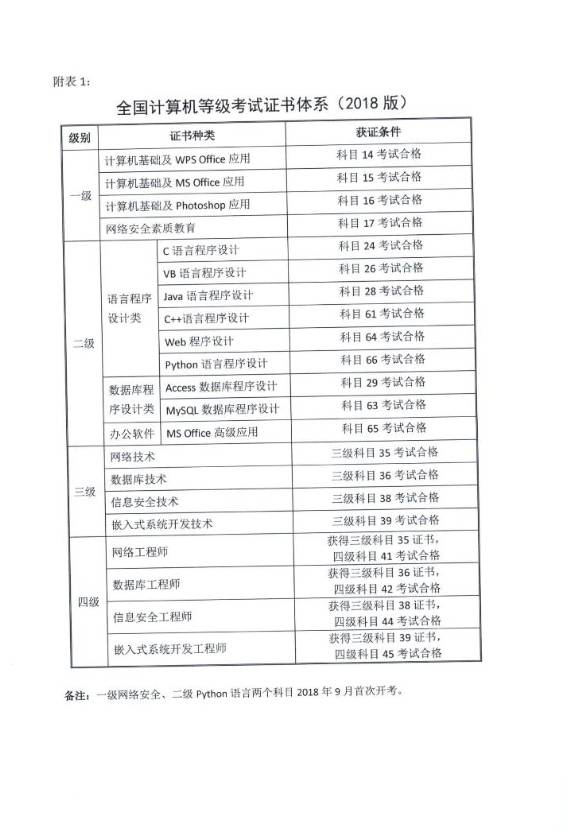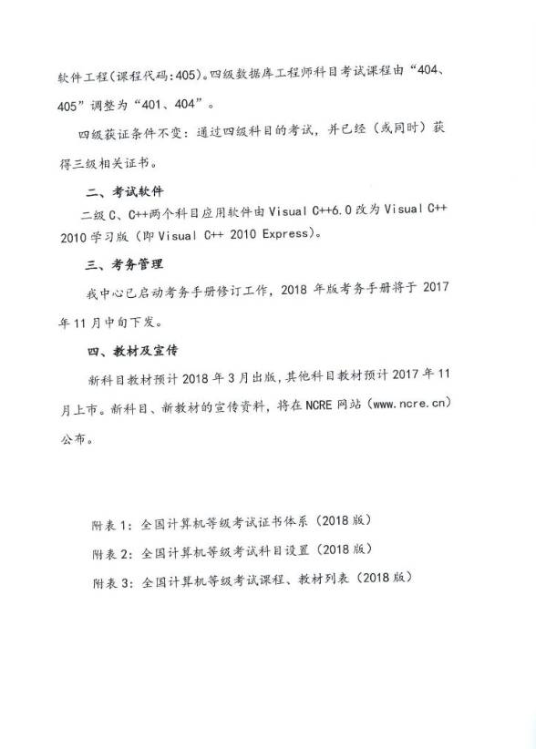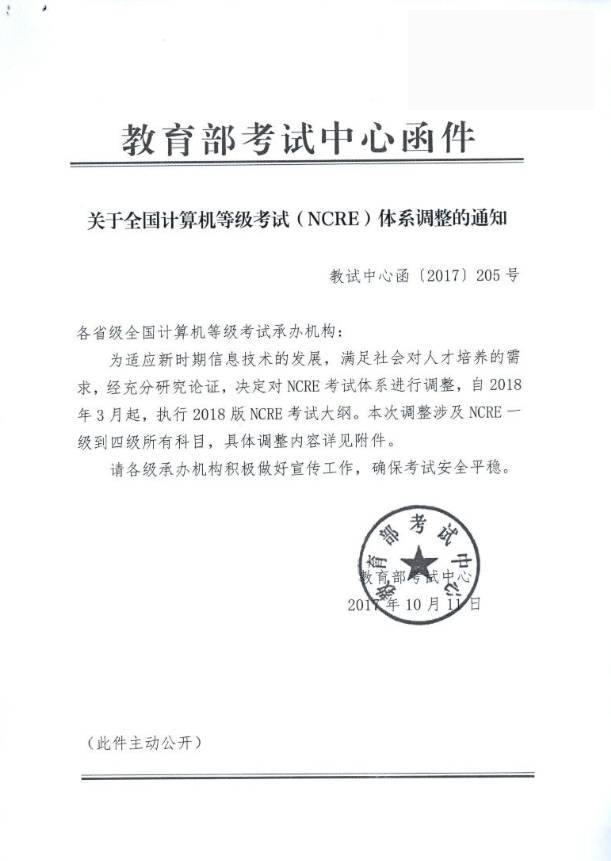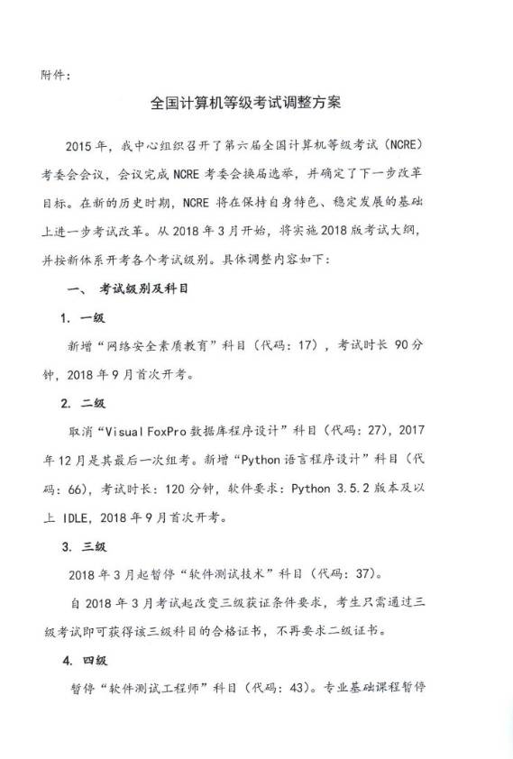 根据教育部考试中心有关文件精神,在新的历史时期,全国计算机等级考试(NCRE)将在保持自我特色、稳定发展的基础上进一步考试改革,自2018年3月起,将执行2018年版NCRE考试大纲。本次调整涉及NCRE一级到四级所有科目,有关详细情况如下: