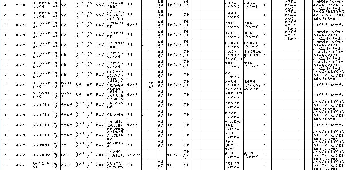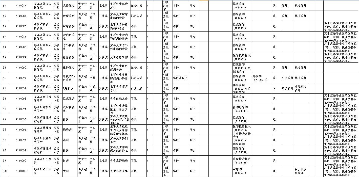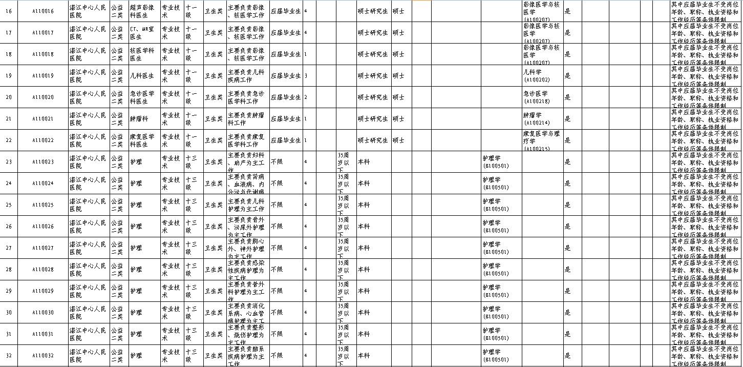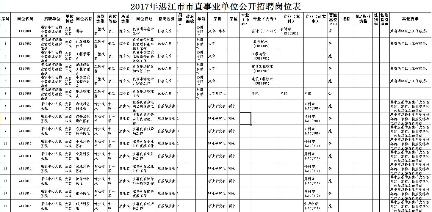 招聘单位、岗位、人数及其具体条件等详见《2017年湛江市市直事业单位公开招聘岗位表》(附件1,以下简称《岗位表》)。