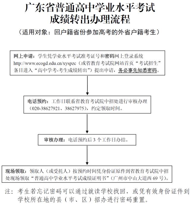 成绩转出由省考试院直接审核。申请成绩转出我省的考生在网上(网址:http://www.ecogd.edu.cn/xyspzc,考生也可以通过广东省教育考试院网站首页“考试招生”条目进入“高中学考-考生成绩转出”)提交申请后,直接与我院中招处联系领取“普通高中学业水平考试成绩证明书”,转出流程详见附件3。