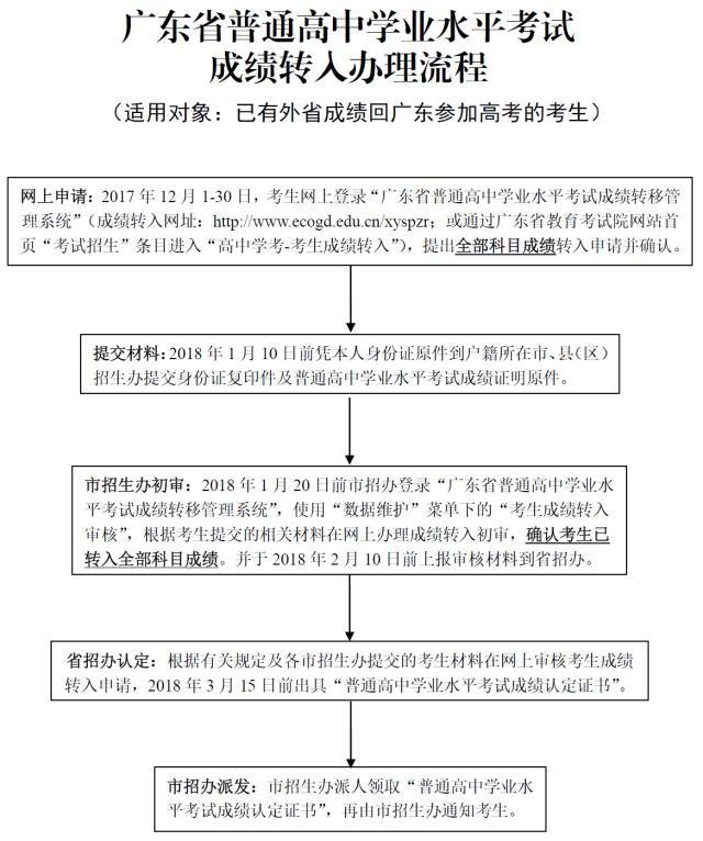 为做好2018年我省普通高中学业水平考试考生成绩转移审核工作,根据《关于印发〈广东省普通高中学业水平考试成绩管理办法〉的通知》(粤考院〔2009〕366号)要求,现将有关事项通知如下: