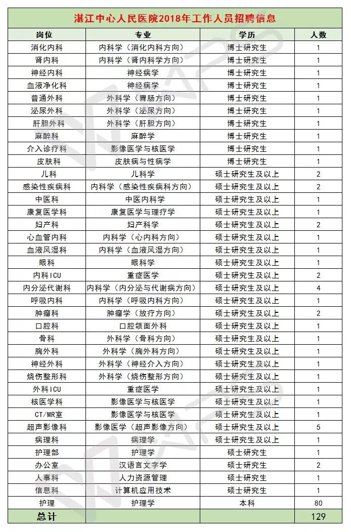 湛江中心人民医院于2017年10月整体搬迁至赤坎区源珠路236号,新院设计理念“生命·港湾”为主题,突出湛江中心人民医院的医疗形象,新院楼群采用相对集中式布局,以中央医疗街为中轴向东西面辐射,如一个停靠着船舶的美丽蓝色港湾。新院总占地面积216亩,地下停车位近3000个,电梯102台,定编床位2000张,有功能完善的门诊楼和住院大楼,有百级标准的净化层流手术室,创下“广东省最大单体医疗建筑”记录。 新院拥有万元以上设备1100多台,配备了瓦里安直线加速器(LA)、美国GE3.0T MRI(磁共振系统)、64排螺旋CT、数字减影血管造影X线机(DSA)等一大批高精尖医疗设备,为患者的诊疗和科研教学提供了有力的技术设备保障。 新院以搬迁和建设为契机,继续坚持“以病人为中心”的宗旨,以“性命为上,健康为本,诚信为事,勤作为民”为服务理念,坚持质量建院、科技强院的发展方略,积极开展各种新技术、新项目,一如既往用一流的医疗技术、一流的管理水平、一流的优质服务、一流的诊疗环境为广大患者提供值得信赖、放心、满意的医疗服务,为湛江人民群众的生命和健康保驾护航! 一、招聘信息 二、联系方式 医院地址:广东省湛江市赤坎区源珠路236号 邮政编码:524000 医院邮箱:zjly2008@sina.com 联系电话:0759-3157406 联 系 人:卢 毅 李志敏 医院网址:http://www.zjhospital.com/ (公告详情可点击方法阅读原文)
