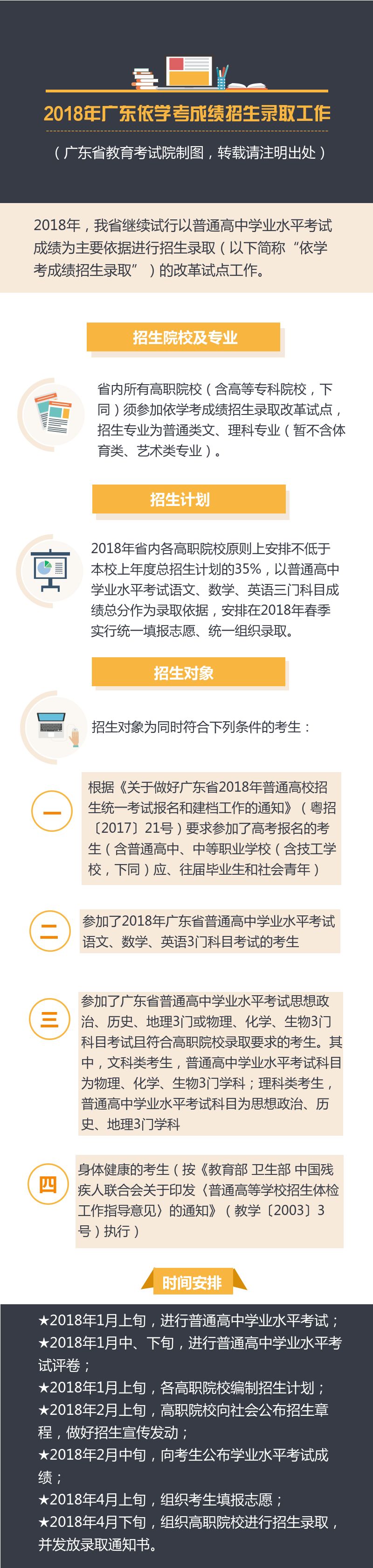 为深入贯彻落实党的十九大精神及国务院《关于深化考试招生制度改革的实施意见》(国发〔2014〕35号,以下简称国务院《实施意见》)提出的 “加快推进高职院校分类考试,高职院校考试招生与普通高校相对分开。分类考试招生录取成为高职院校招生录取的主渠道”的要求,根据《广东省人民政府关于深化考试招生制度改革的实施意见》(粤府〔2016〕17号)、《广东省教育厅关于增加普通高中学业水平考试科目推进高职院校分类考试招生的通知》(粤教考〔2016〕6号)和《广东省教育厅、广东省招生委员会关于2018年深入推进普通高等学校考试招生改革的通知》(粤教考函〔2017〕5号)有关要求, 2018年,我省继续试行以普通高中学业水平考试成绩为主要依据进行招生录取(以下简称“依学考成绩招生录取”)的改革试点工作。