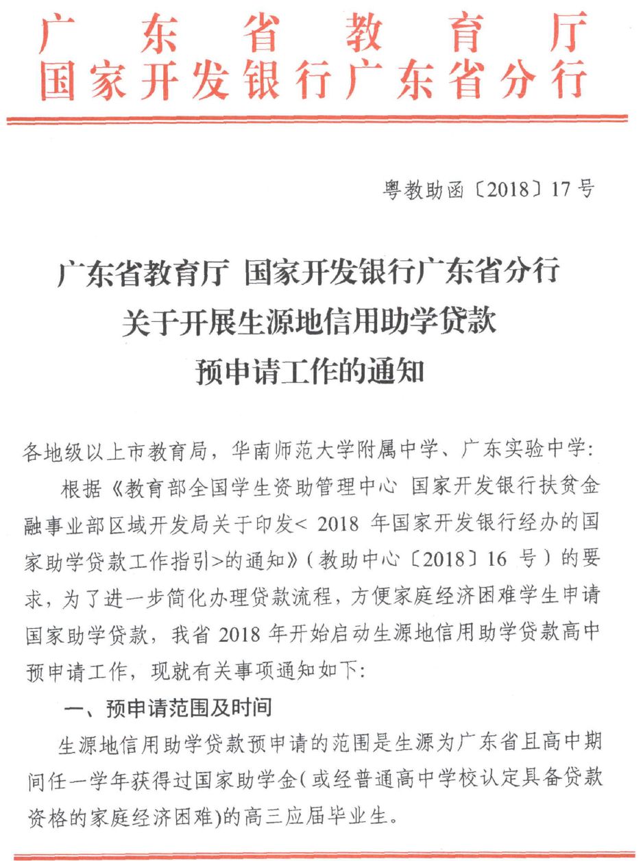 对于2018年广东的高三同学来说,广东省教育厅日前发出的《广东省教育厅 国家开发银行广东省分行关于开展生源地信用助学贷款预申请工作的通知》无疑是一个重磅消息:为了进一步简化办理贷款流程,方便家庭经济困难学生申请国家助学贷款,我省2018年开始启动生源地信用助学贷款高中预申请工作。