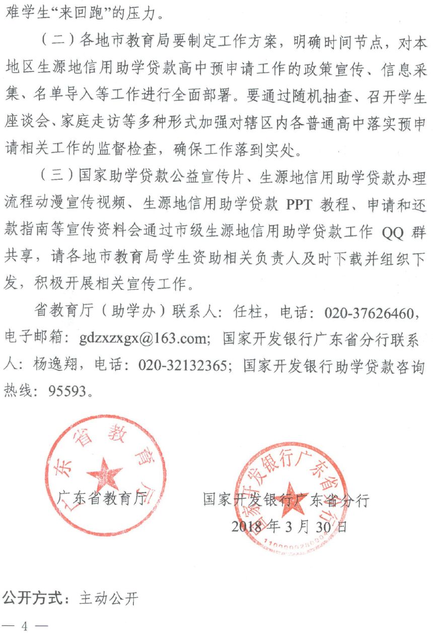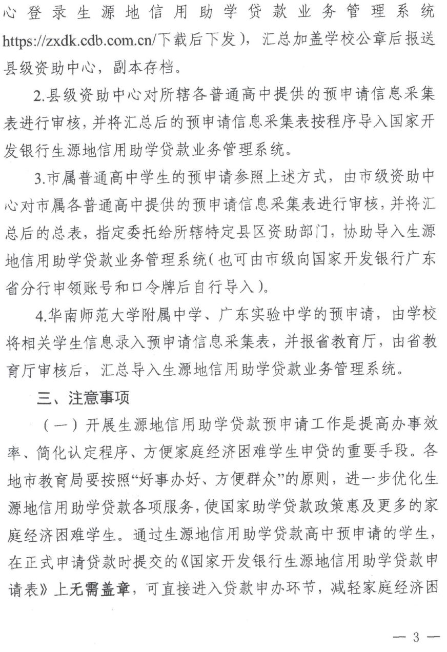 3.市属普通高中学生的预申请参照上述方式,由市级资助中心对市属各普通高中提供的预申请信息采集表进行审核,并将汇总后的总表,指定委托给所辖特定县区资助部门,协助导入生源地信用助学贷款业务管理系统(也可由市级向国家开发银行广东省分行申领账号和口令牌后自行导入)。